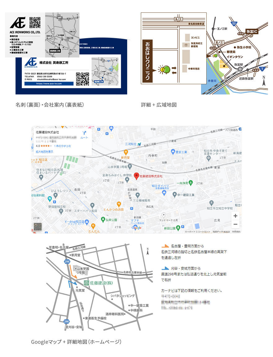 初めての場所や入り組んだ道では、アクセスマップは依然として頼りになります。地図を読むことが苦手な人にも、スムーズに目的地まで来ていただくためには、訪れる側の視点を考えてアクセスマップを作成します。